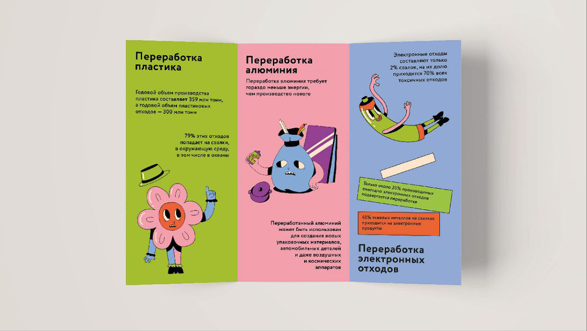 Благодаря выбранному стилю материалы кажутся живыми и современными, это помогает повышать интерес к теме экологии и проще доносить важные послания.
