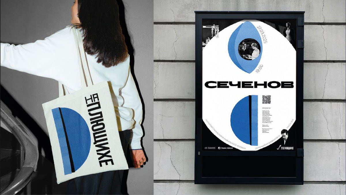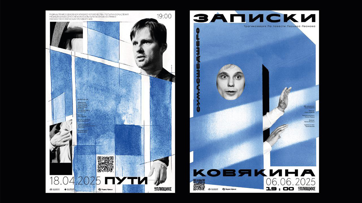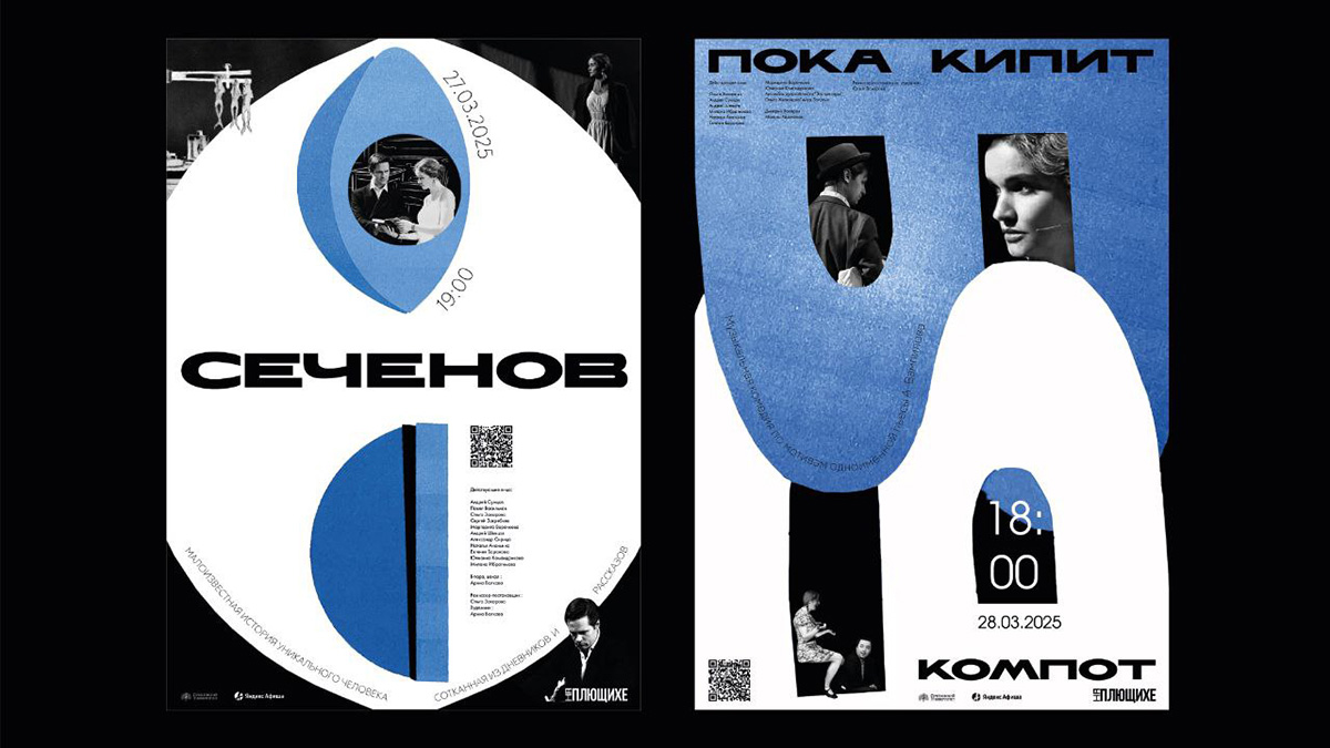 За акцент отвечает рубленый шрифт Floripa — он отсылает к плакатам прошлого века. Для основного текста выбраны современные и лёгкие Futura и RF Tone. Цвет выбран не просто так. Театральный центр открыт Сеченовским университетом, у которого синий — фирменный.