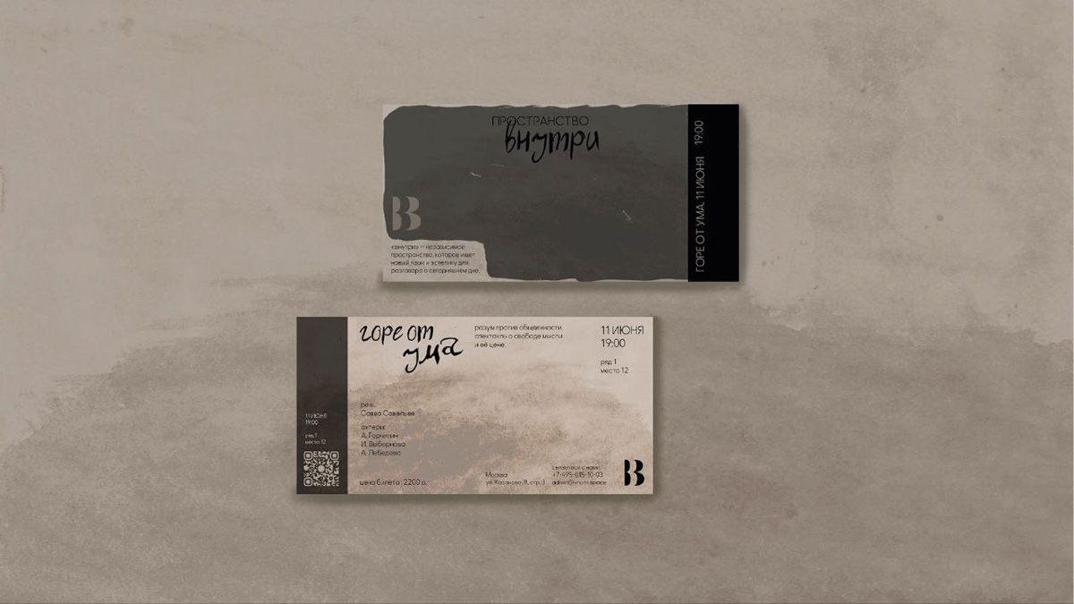 В диплом вошли: фирменный знак и базовая система, афиши и билеты для спектаклей «Шинель», «Горе от ума», «Три сестры», «Мёртвые души», «Петушки», «Зеркало», а также макеты для соцсетей, программки и информационные листы. Все носители подчинены общей логике: единая типографика, сетка и принципы работы с изображением, но при этом каждый спектакль получает свой характер.