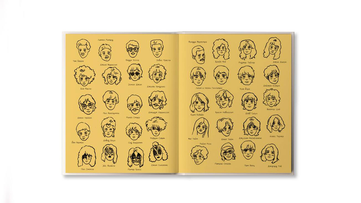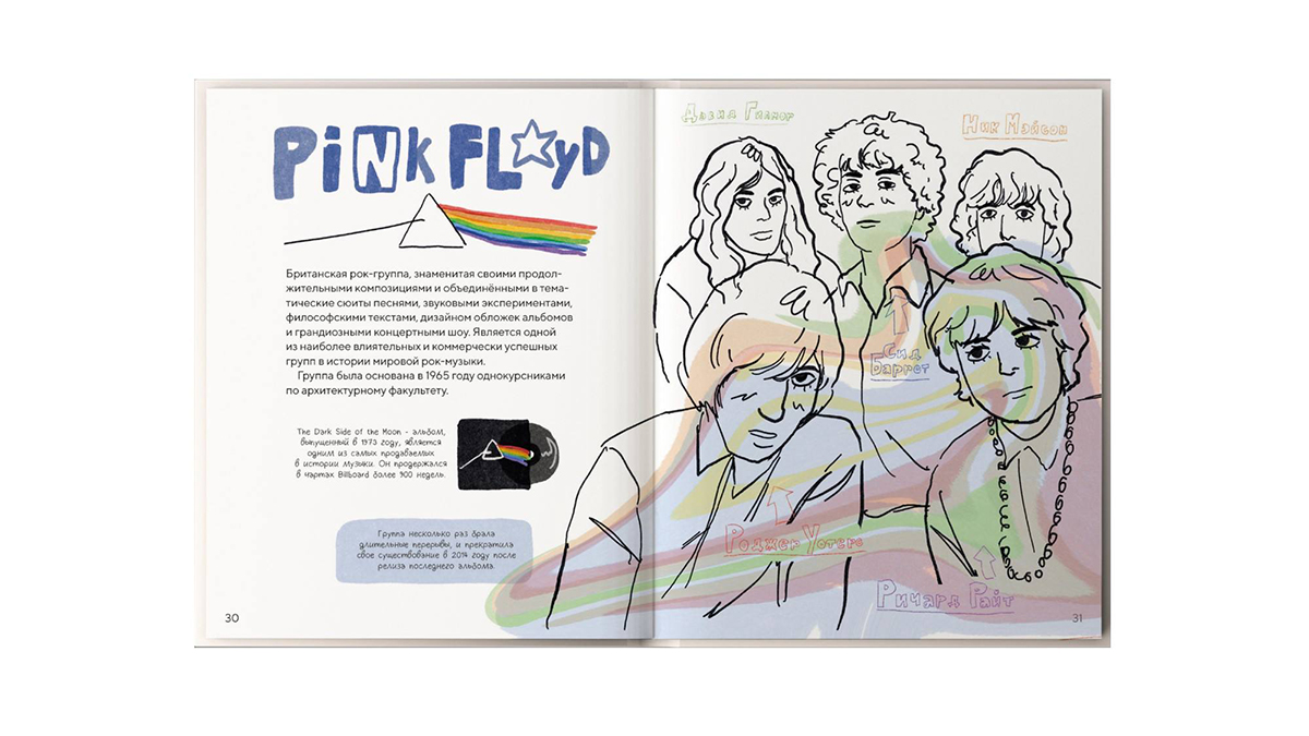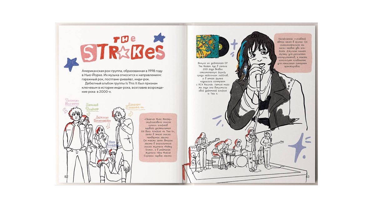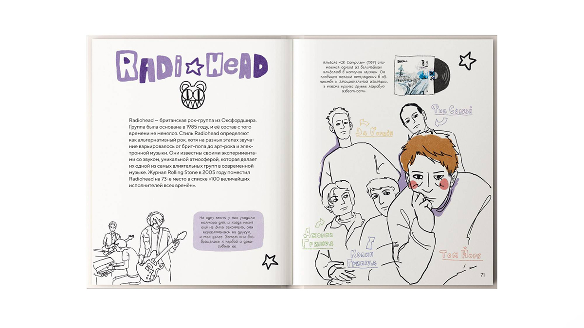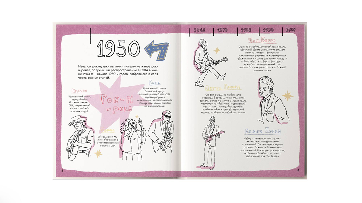 В каждом разделе есть цветная рамка, описания групп и поджанров, а на разворотах с персоналиями — интересные факты и крупные иллюстрации.